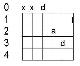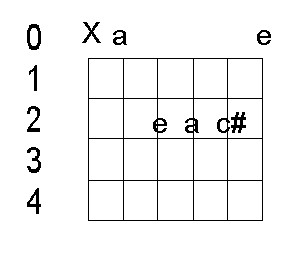 (A on fret 5) (E on fret 4) (D on fret 5) (Dm on fret 3)