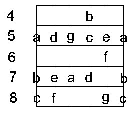 The following table shows which fret to place your 4th finger to play the corresponding Scale. We will start art fret 4 because that is the first place that you can play this shape in its entirety:-