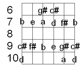 To get the explanation on how the moveable scales work go to Moveable Scale Shapes 1 or 2. Here is the A Major Scale Shape 3. There are 5 moveable scale shapes that can be used for all the Major scales (keys). Below is the third moveable scale shape in A Major.