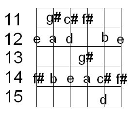To get the explanation on how the moveable scales work go to Moveable Scale Shapes 1 or 2. Here is the A Major Scale Shape 5. There are 5 moveable scale shapes that can be used for all the Major scales (keys). Below is the fifth moveable scale shape in A Major.