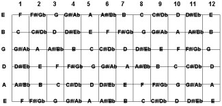 The first diagram shows part of the fretboard of a guitar. In the bottom left hand corner is the letter E.